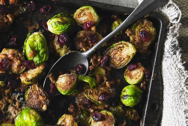 - Remove the sprouts from the oven, lift away the foil and pour over the softened peanut butter. Use a spatula to gently turn the sprouts over, so that every piece is covered in peanut butter. Return to the oven without the foil for another 10 minutes until the sprouts are completely soft and charred in places. Scatter over the cranberries and serve warm.