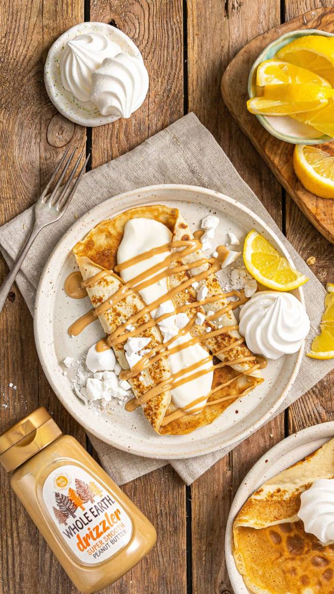 Drizzle each pancake generously with Whole Earth Drizzler Super Smooth peanut butter and squeeze over some lemon. Garnish with mini meringues if using.