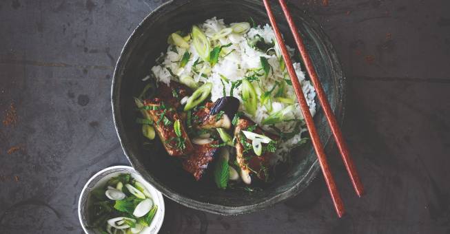 - Serve the rice in warm bowls, slice the aubergine halves into 6 pieces each and arrange on top of the rice. Top with the spring onions and mint and serve straight away.