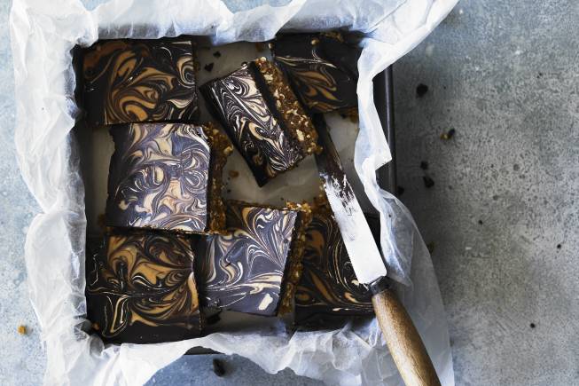 Working quickly, heat the remaining peanut butter in a pan until liquid but not boiling. Use a teaspoon to dot liquid peanut butter all over the surface of the chocolate, then use a knife to create an attractive swirl pattern over the top. Cover and return to the fridge for at least 2 hours before cutting into 9 squares.