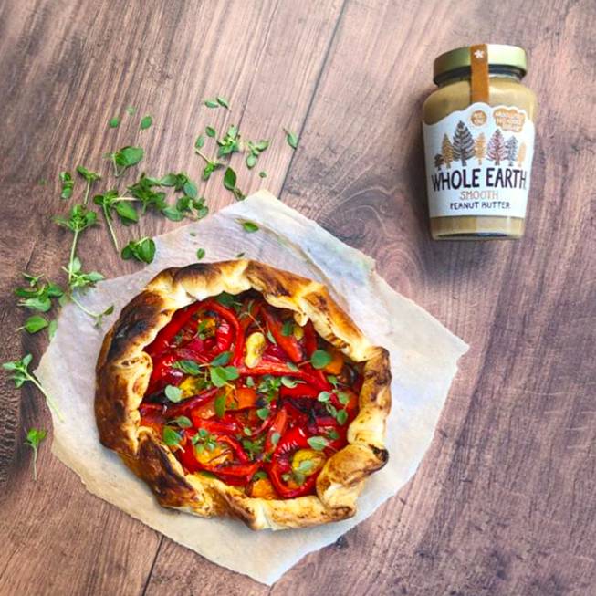 While the vegetables are in the oven, roll out the pastry sheet on a lightly floured surface until it has increased in size by 1/3 all over. Cut a rough 28cm circle out of the pastry and save the rest for another time. Mix the cream cheese and the Whole Earth peanut butter together in a bowl and spread it from the centre of the pastry circle to within 2cm of the outside edge. Remove the peppers and tomatoes from the oven and allow them to cool slightly. Top the peanut butter mixture with the vegetables, leaving a 3cm ring around the outside edge. Roughly fold and pinch the pastry to create a raised edge, so the peppers and tomatoes are safely encased. Slide the pastry onto a parchment-lined baking sheet that will fit in the fridge and chill for 30 minutes.